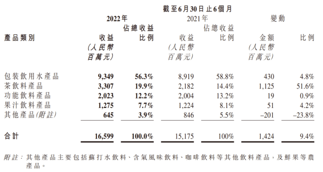 这或许是农夫山泉的产品战略,通过桶装水市场的增长,由品类应用到单品中,进而扩大单品的消费增长空间。2022年上半年,农夫山泉五个品类中,茶饮料产品仍在保持较快增长,收入33.07亿元,同比增长51.6%,总收入占比也由上年同期的14.4%,提升至19.9%。