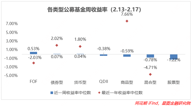 由于上周土耳其地震造成的石油、天然气等大宗商品价格急速拉升,因此商品型基金的周收益率中枢改善最为明显,环比+1.92pct,同时依旧维持最近一年收益率中枢最高的地位。各类基金周收益率在上上周下滑后上周的降幅不大,都在-0.5pct以内。债券型、货币型基金变化幅度不大。
