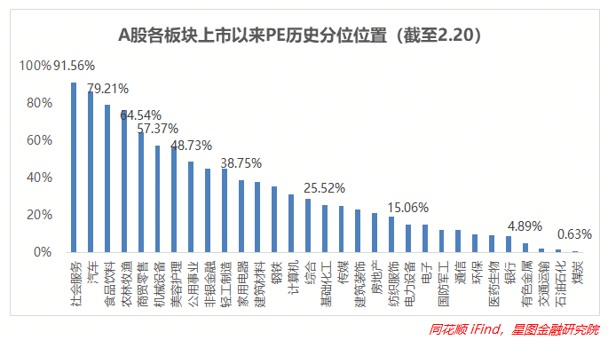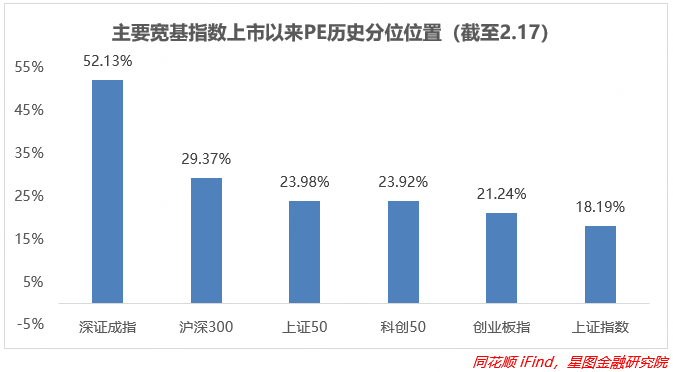 从上市以来板块分位值来看,截至2月20日收盘,16个板块估值下修,估值分位数平均上升1.49pct。周末高频领先数据、水泥价格年内首次回升给了市场信心,因此工程制造板块修复力度最大,建材、轻工制造分别环比+4.95pct、+4.05pct。注册制的催化、板块下跌后的补涨等使银行、家电、非银均上修2pct以上。电力设备下修超过5pct,国防军工则环比-3.5pct。板块估值中位数为基础化工(25.52%)。
