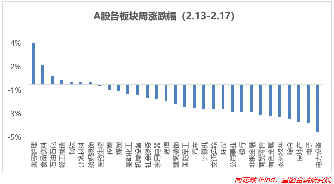 从板块来看,周内仅7个一级板块实现上涨,环比减少9个板块,下滑趋势有所扩大,赚钱效应进一步下滑,基本是全行业普降的行情。涨幅靠前的聚集在消费、上游资源行业,比如美容涨幅高达3.53%,食饮涨超1.6%,石油石化、钢铁涨幅靠前。