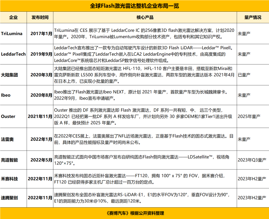 Flash激光雷达不是最近才“走红”的,据《赛博汽车》不完全统计,截至目前,全球公开宣称布局Flash激光雷达的整机企业已超过10家。