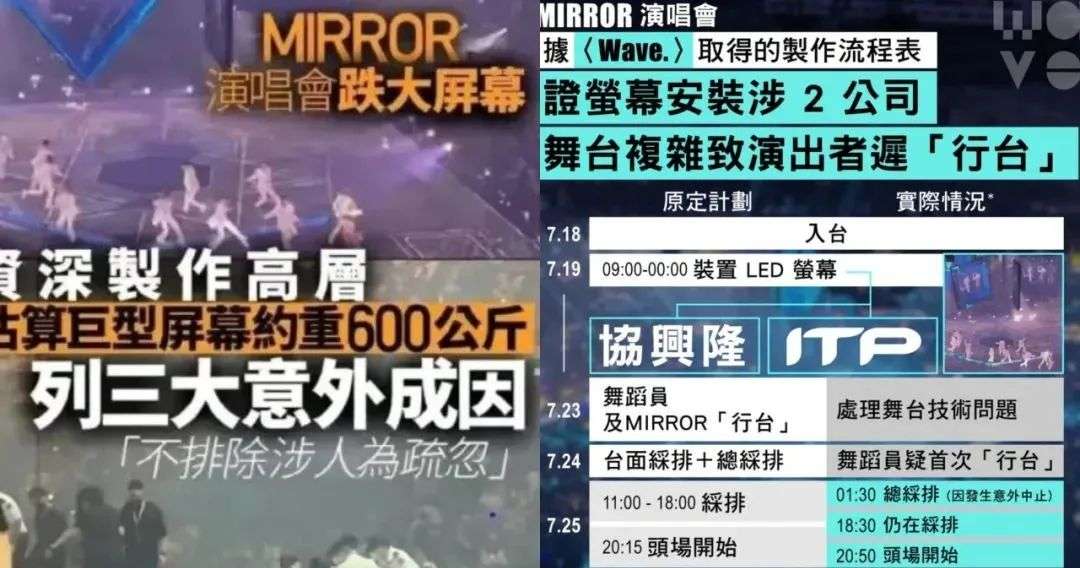 7月28日晚,正值香港当红男团MIRROR第四场红馆(即红磡体育馆)演唱会开唱期间,一面重达600公斤的显示屏突然坠落,击中两名闪避不及的伴舞,造成近十年来最严重的舞台事故。
