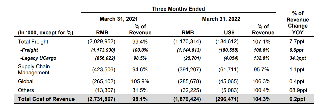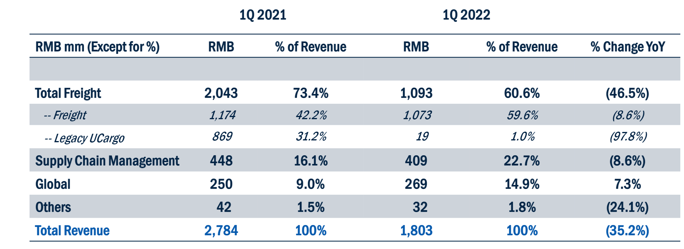 这第一季度百世优货业务的营收业绩与百世快运合并。百世快运2022年第一季度业务营收10.93亿元,相比去年同期的20.43亿元,同比下滑46.5%,占总营收的比重为60.7%。