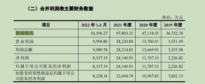 数据显示,2019-2021年以及2022年1-3月,博隆技术实现的营业收入分别为36732.18万元、47118.55万元、97803.32万元以及30506.27万元,同期内的归属净利润分别为2226.82万元、11747.15万元、24140.91万元、8537.19万元。