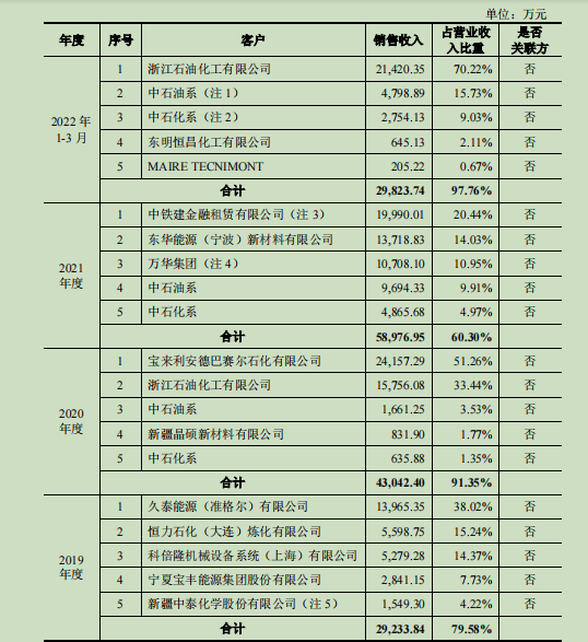 钛媒体APP注意到,除了中石油系、中石化系2020年以来连续跻身前五大客户之列,博隆技术报告期内其他大客户稳定性不高。例如2019-2021年以及2022年1-3月期间,博隆技术第一大销售客户分别为久泰能源(准格尔)有限公司、宝来利安德巴赛尔石化有限公司、中铁建金融租赁有限公司、浙江石油化工有限公司。可见,第一大客户成“流水席位”,期间前述客户的收入占比分别为38.02%、51.26%、20.44%、70.22%。
