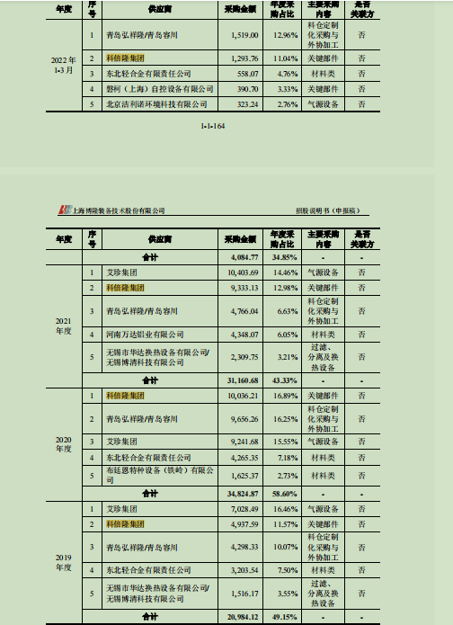 据招股书,2019-2021年以及2022年1-3月,博隆技术向科倍隆集团的采购金额为4937.59万元、10036.21万元、9333.13万元、1293.76万元,对应的采购占比为11.57%、16.89%、12.98%、11.04%。科倍隆集团报告期内处于博隆技术前两大供应商的地位,博隆技术向科倍隆集团都是采购关键部件。
