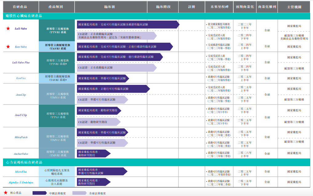LuX-Valve是公司自主研发的第一代经导管三尖瓣置换系统,专为重度三尖瓣返流及高手术风险患者而设计,预计在2023年下半年实现商业化;Ken-Valve是第一代经导管主动脉瓣置换系统,为治疗重度主动脉瓣返流(或合并主动脉瓣狭窄)而设计,预计在2024年上半年实现商业化。