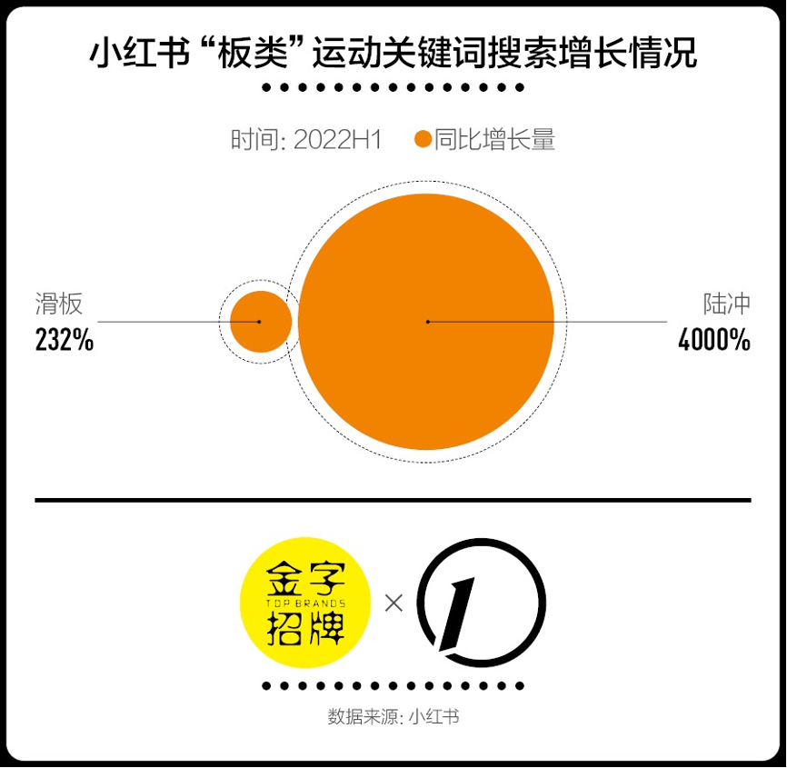 今年上半年,小红书上「滑板」类别的相关搜索量同比增长232%,其中陆冲热度增长最快,同比增长42倍。数据显示,陆地冲浪板从今年2月搜索量开始暴涨,6月小红书陆地冲浪板比去年同期增长约50倍。目前,在小红书搜索「陆冲」关键词,相关的笔记分享已经达到6万+篇,其中不乏、陆冲板教学、陆冲板推荐养等话题。