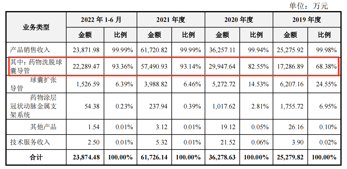 报告期内,垠艺生物收入九成以上都来源于冠脉药物洗脱球囊导管及球囊扩张导管两款产品,其中大部分营收来自于药物洗脱球囊导管。招股书显示,2019年至2022上半年,以上两款产品收入合计占主营业务收入比例分别为92.94%、97.08%、99.6%和99.76%,其中药物洗脱球囊收入占主营业务收入比例分别为68.38%、82.55%、93.14%和93.36%。