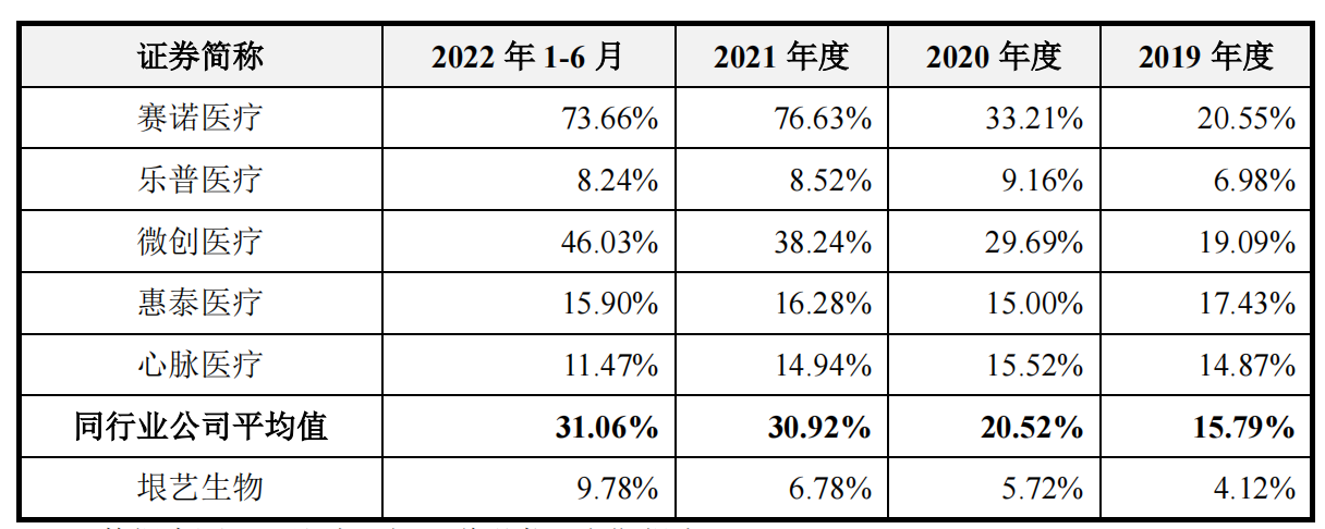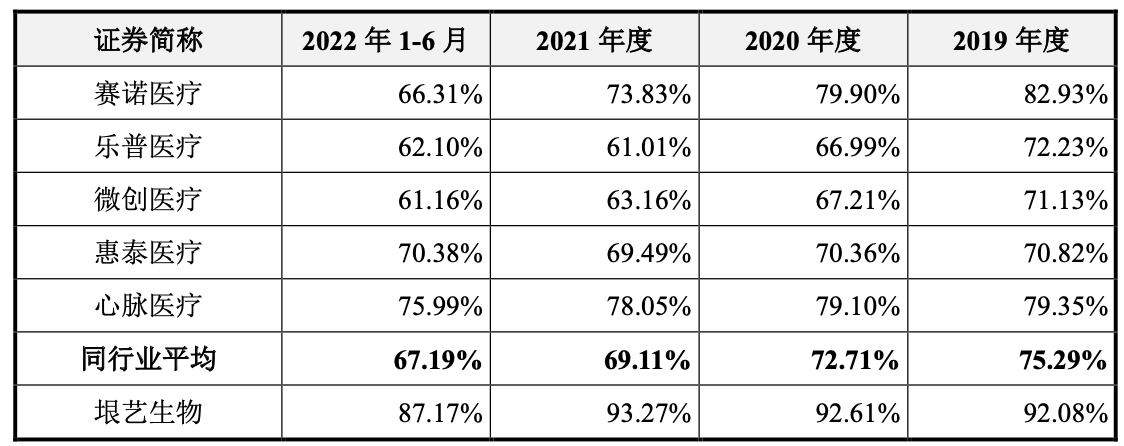 而奇怪的是,垠艺生物虽然研发费用最低,毛利率却远高于同行,虽然去年上半年毛利率下滑至87.17%,仍较行业均值高出20个百分点。