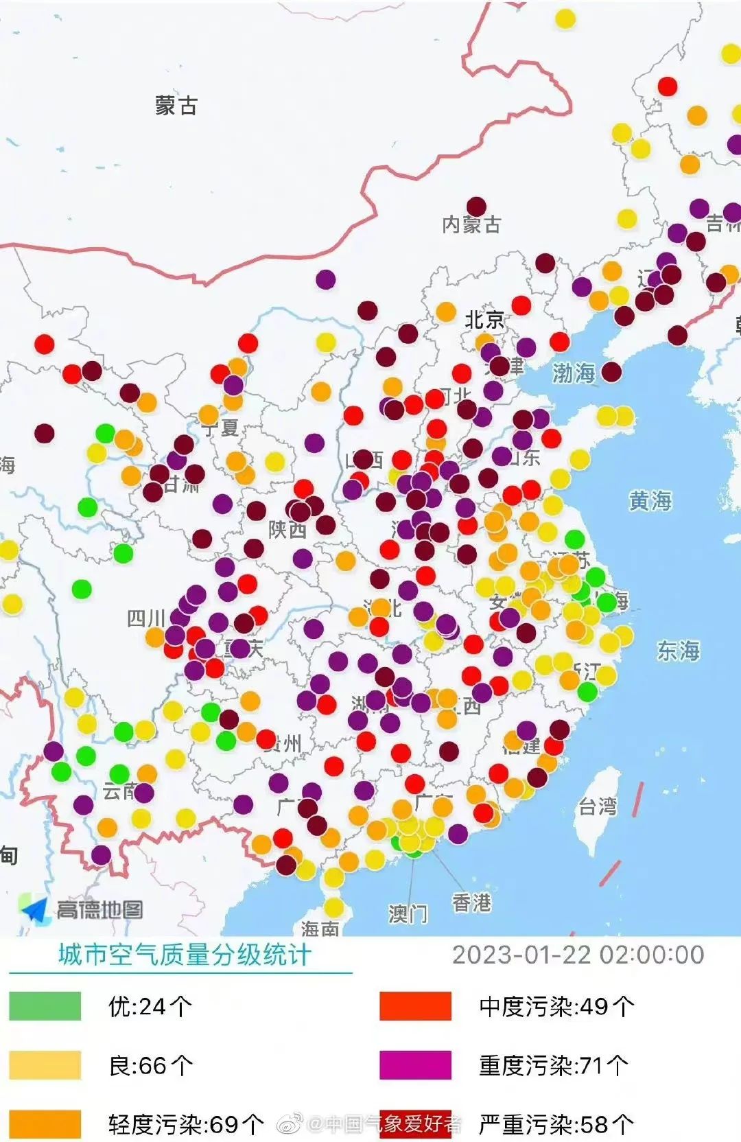 环保方面,燃放烟花爆竹与空气质量恶化仍存在紧密的联动关系。下图为微博专业博主——中国气象爱好者发布的除夕到大年初一期间全国空气质量图。