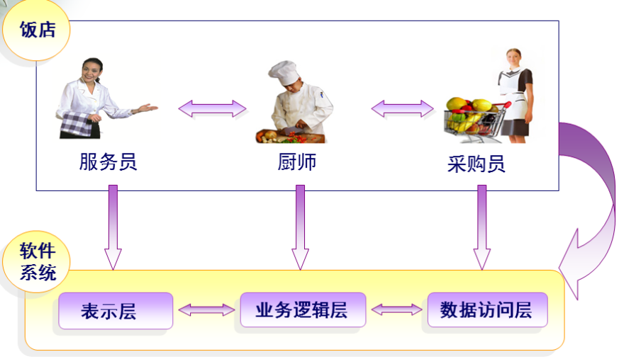 俗话说,思想来源于生活,我就用上面顾客到餐馆吃饭的例子来类别。其实,下面这张图就很形象地概括了三层架构: