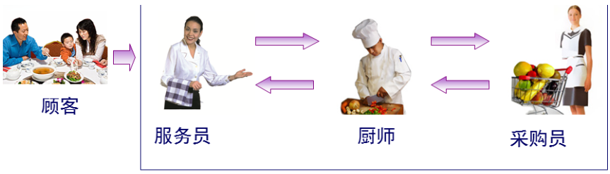 他们各负其职,服务员不用了解厨师如何做菜,不用了解采购员如何采购食材;厨师不用知道服务员接待了哪位客人,不用知道采购员如何采购食材;同样,采购员不用知道服务员接待了哪位客人,不用知道厨师如何做菜。