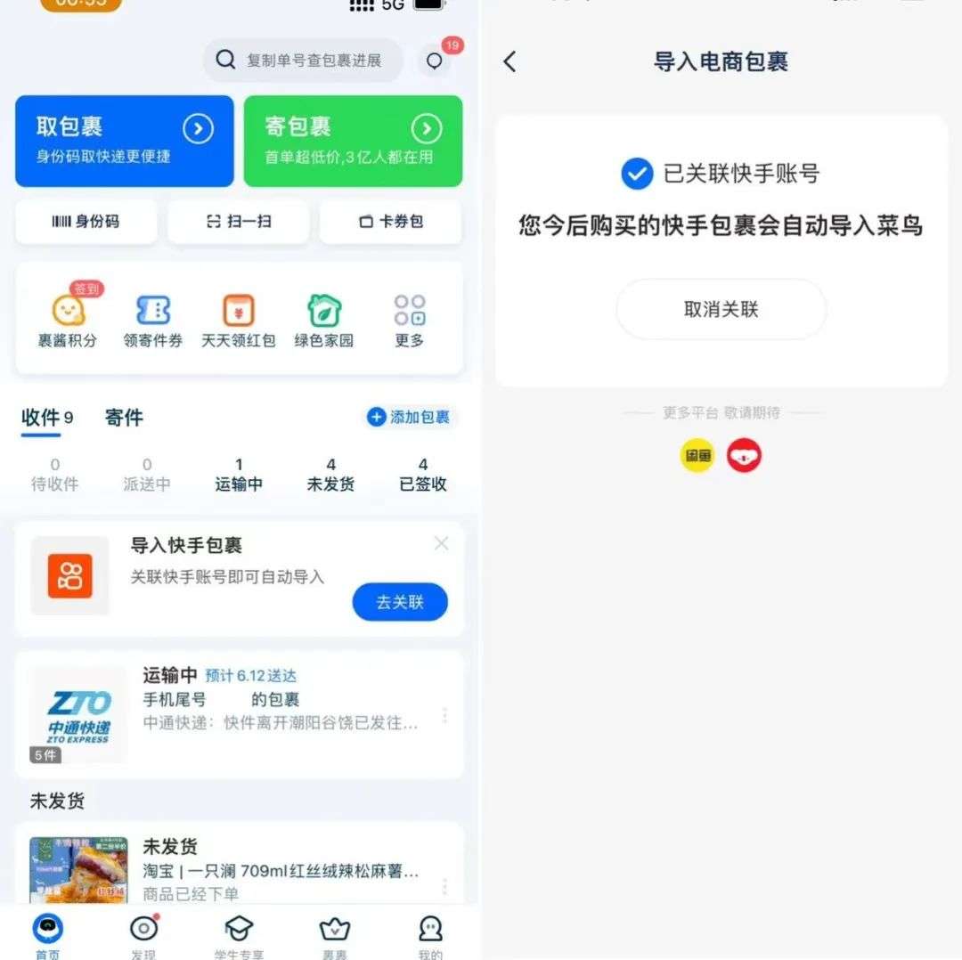 陆玖财经最近独家发现,打开菜鸟APP,首页竟然自动提示可以导入快手包裹,只需要关联快手账号即可完成自动导入。这也就意味着,快手接入菜鸟了,之后用菜鸟可以直接查询到快手包裹,无需再输入单号进行关联。