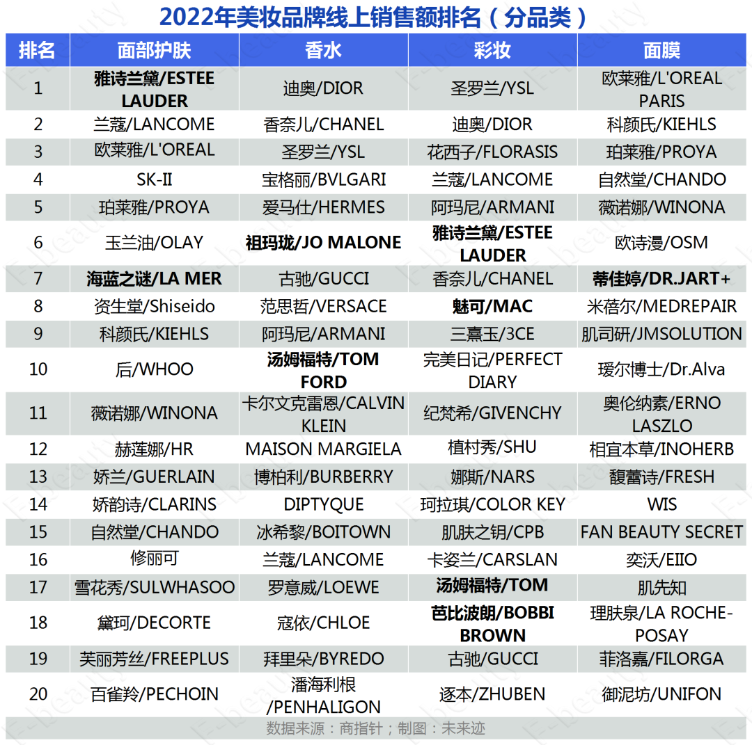 根据商指针监测的天猫、京东、抖音等17个线上平台销售数据,在2022年全年,雅诗兰黛集团旗下的多个品牌在线上销售中取得了亮眼的成绩,涵盖面部护肤、香水、彩妆、面膜等多个品类。