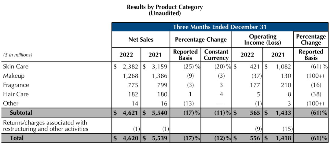 彩妆的净销售额为12.68亿美元(约合人民币85.37亿元),同比下降9%。其营业利润录得负增长,下滑幅度超过100%,是四大业务中营业利润下滑最大的板块。