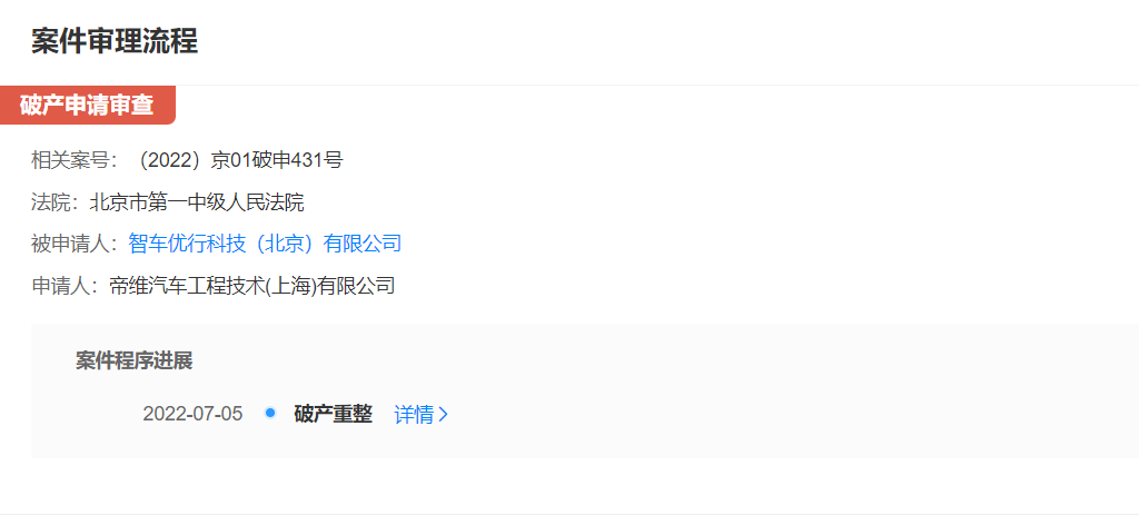 另据连线出行查阅天眼查平台,看到智车优行北京分公司在近日被强制破产重整,申请人是帝维汽车工程技术(上海)有限公司。基于这一消息,一些奇点员工向连线出行表示“完了,看来工资要不到了。”
