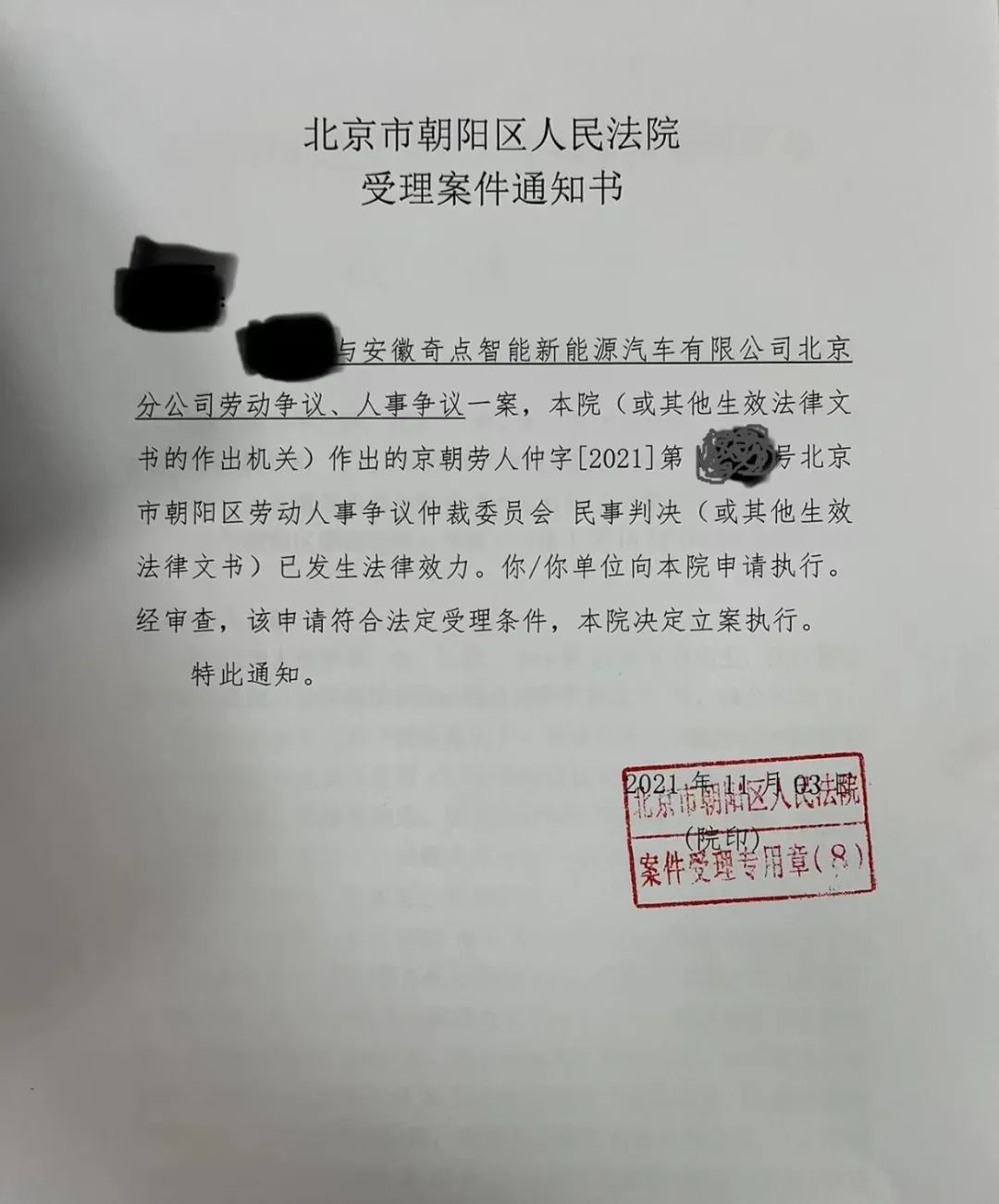 劳动仲裁通知书,图源受访者
