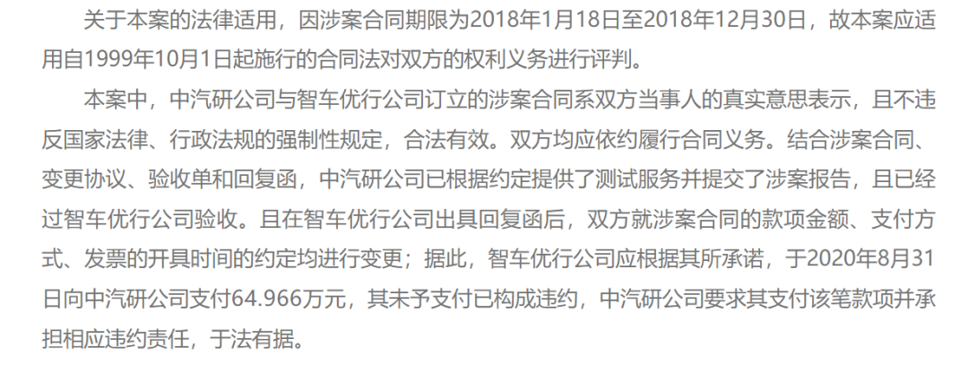 到了2019年4月,中汽研发表公告表示已在约定时间完成测试并顺利通过验收,但智车优行并未按时支付全部合同费用,并在2020年5月发函承诺于在2020年8月支付欠款64.966元,但截至宣判前智车优行都未支付费用,由此判决智车优行北京公司存在合同违约事实。