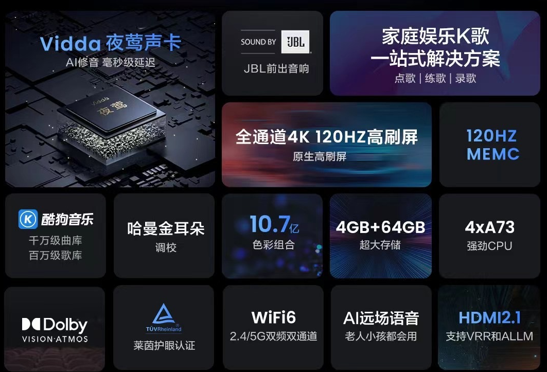 除了以上亮点,Vidda MUS其他方面的表现也相当不俗,配备全通道4K 120Hz高刷屏,支持130%高色域、10.7亿色彩以及MEMC运动补偿等,同时搭载MT9652处理器,4GB+64GB的超大存储组合,这完全就是一台游戏电视的配置。而为了进一步凸显音乐电视的特性,Vidda与JBL联合设计了HiFi级音响系统,61W大功率2.1声道前出音响,包含25W独立低音炮,能实现更为澎湃震撼的立体音效体验。系统内置专门的K歌频道,支持点歌、练歌和录歌多种模式,囊括酷狗超300万首K歌曲库。