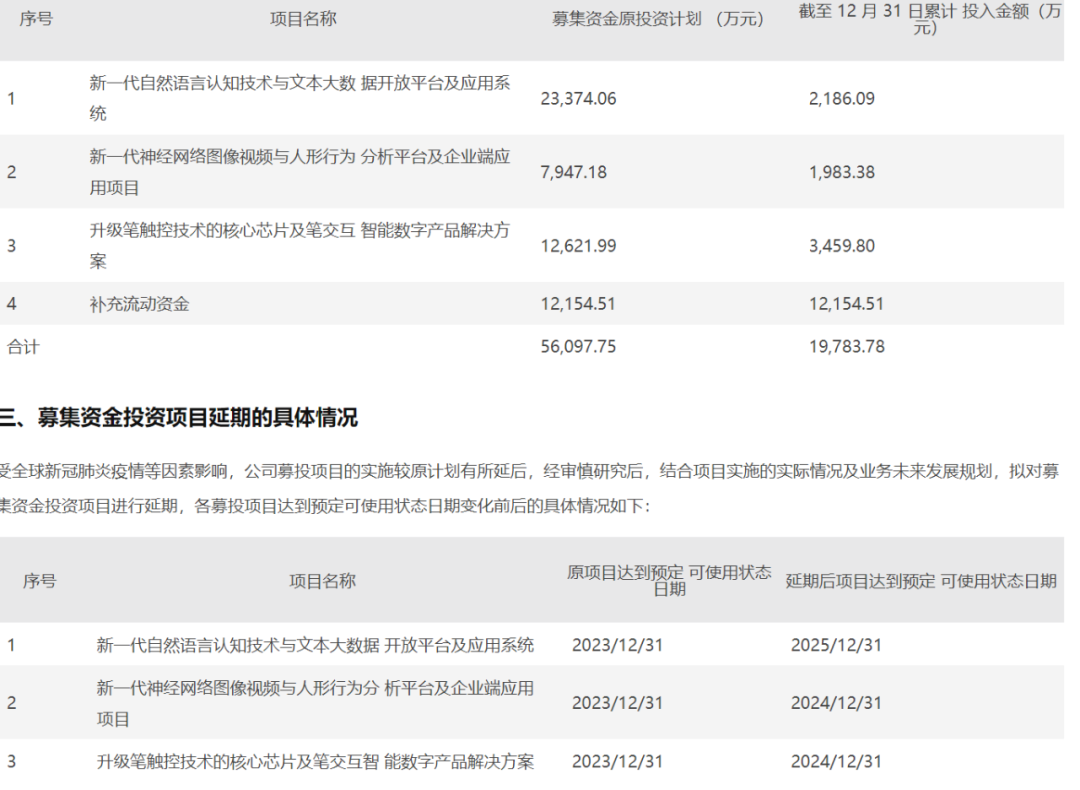 正因如此,在与ChatGPT相关的NLP和OCR相关项目上,汉王科技才需要进行定增融资。公告显示,2020年5月13日,公司有过一次6亿的定向增发,其中2.5亿将会投入“新一代自然语言认知技术与文本大数据开放平台及应用系统”。2021年报显示,在本年年初,前述项目期初余额为0,可见是在2021年内项目启动开发,该年投入金额为2108万元。