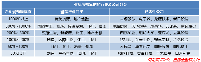 从业绩增幅上看,增长率top10公司行业分布比较均匀,并无绝对的优势行业,其中传统资源、TMT、制造各占两席,地产金融、消费、国防军工、信创各占一席。增速在0%-50%的公司有74家,50%100%之间的公司67家,100200%的公司有39家,200%500%的公司21家,500%1000%有6家,1000%以上有4家。而暂时为年报业绩预增王的吉翔股份则是唯一破20倍的公司,达到了26倍,剩余几家增速较快的公司在15倍左右。除此之外,在预增公司中还有5家公司增速为负。
