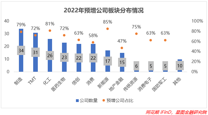 从行业数量来看,制造业中业绩预增的公司数量最多,达34家,在预增公司中占比15.7%,进一步凸显我国制造业处于持续发展中,同时也可以反映出我国2022年为实现稳增长在制造业方面的工作实物量有效达成,推动行业回暖向好;TMT行业次之,有31家,是唯二超过30家的行业;随后是化工行业26家,医药生物板块23家,消费22家,信创23家,新能源17家,地产金融15家,传统资源、军工及消费电子都在5家左右,其余行业公司共10家。
