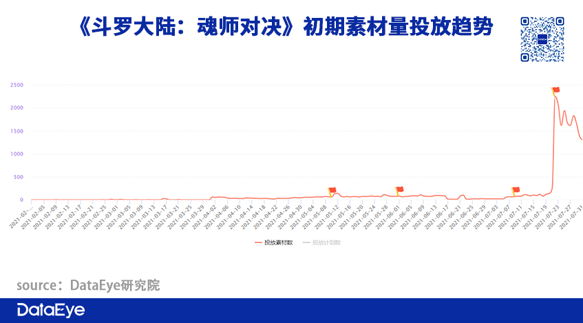 而同为国漫IP改编游戏的《斗罗大陆:魂师对决》的投放趋势相比,则略有不同。根据DataEye-ADX数据显示,《斗罗大陆:魂师对决》上线前3个月进行相对稳定的预热投放。而在产品上线时,整体力度加大,单日超过2000余组。