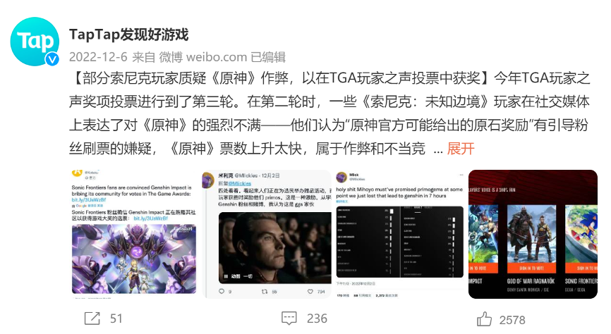 事情的经过并不复杂,由于《原神》在第二轮票选环节得票数的飞快上涨,一些索尼克的粉丝在Twitter等社交平台发文造势,指责米哈游通过向玩家发放原石的方式“贿赂”玩家刷票。