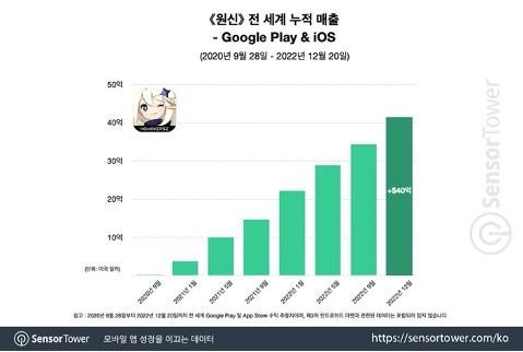 在刚刚结束的2022年,《原神》也交出了一份亮眼的成绩单——据Sensor Tower统计,《原神》在推出2年多的时间里在移动端创下了超乎想象的收入,疯狂吸金超276亿元(40亿美元)!《原神》还登陆了PC、PS4与PS5平台,上述平台的流水数据并不对外公开。