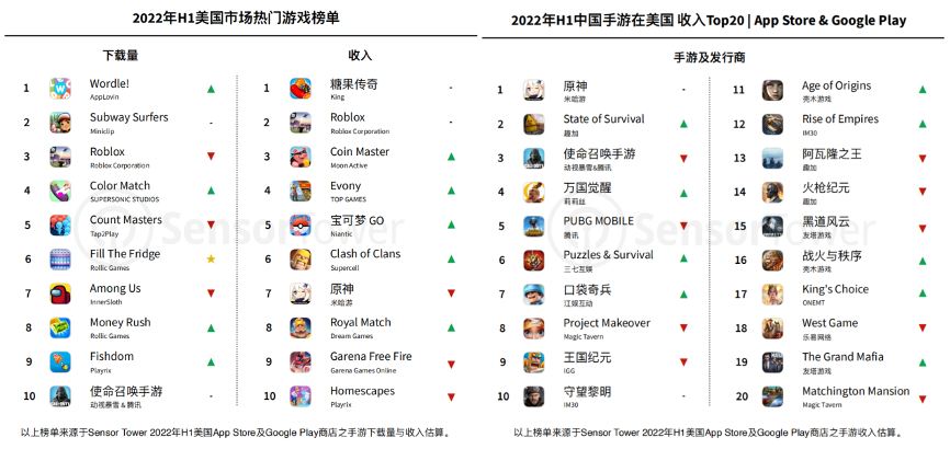 具体到美国手游市场,仅在2022年上半年,《原神》便凭借9.45亿元的收入,成为中国出海美国手游中最能吸金的产品。其存在也搅动着美国本土手游市场的格局,“以一己之力将开放世界RPG子类别推向移动市场变现能力最强的子类别之一。”