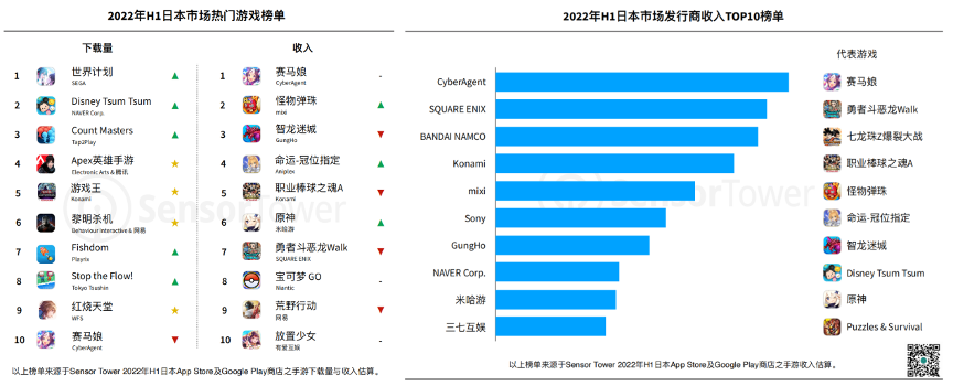 到2022年上半年,《原神》在日本热门手游收入榜中位列第六,力压一众日本本土手游。而米哈游也凭借《原神》,在日本收入排名前十的手游厂商中位列第九,与素来强悍的日本本土手游厂商相比也不遑多让。
