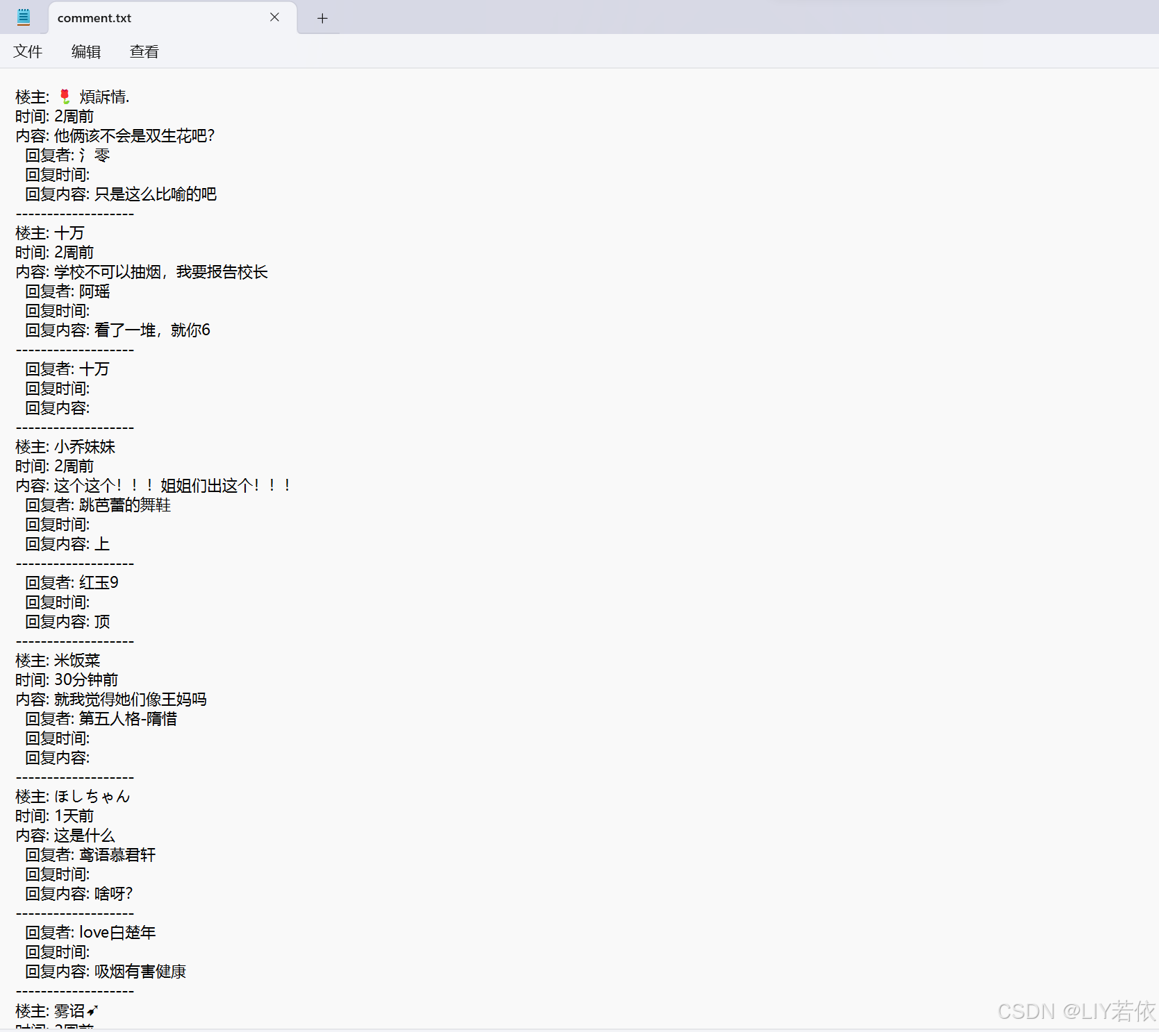 comment.txt的文本文件,以写入模式('w')打开,并设置编码为utf-8。- 将提取到的评论内容逐行写入到文本文件中,包括作者、时间和内容。- 对于每个评论项,还会获取其所有的子评论项,并提取子评论的作者、时间和内容。子评论的作者通过CSS选择器.reply-name定位,时间通过CSS选择器.comment-sub-item-time定位,内容通过CSS选择器.comment-item-content定位。- 将子评论内容也写入到文本文件中,并在每个评论项之间添加分隔线。 - 关闭浏览器:- 使用