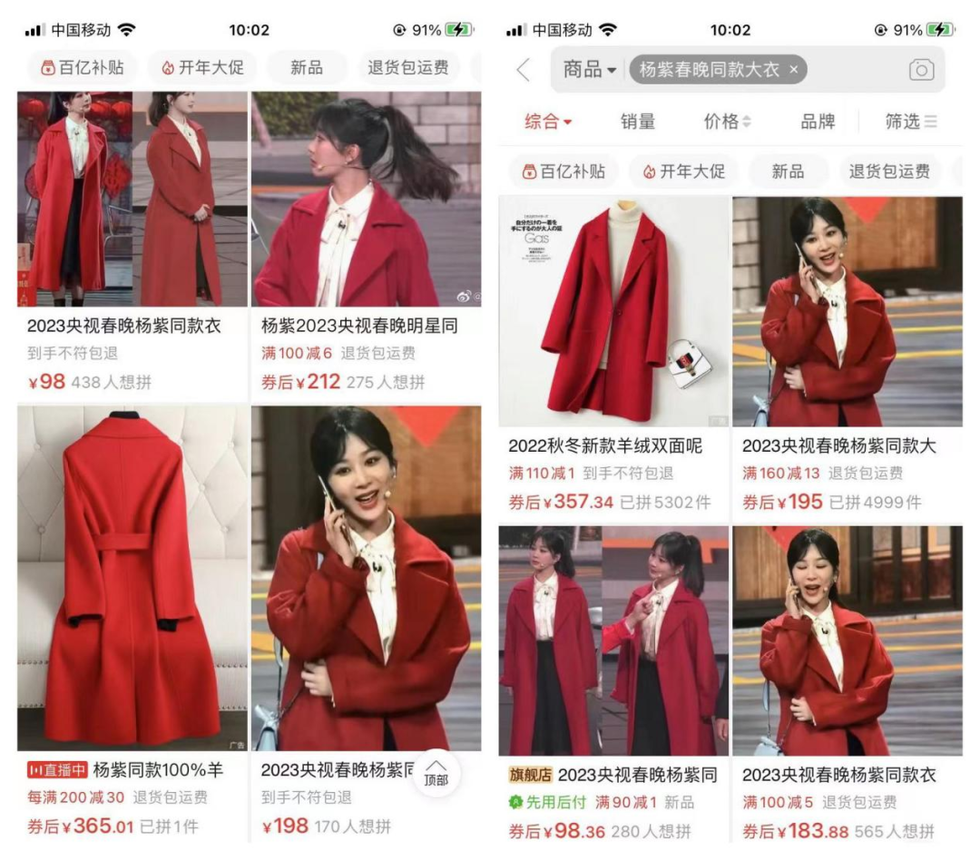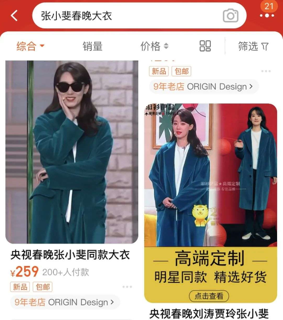 以今年的春晚为例,自晚8点开始,众多明星的同款服装悉数亮相登上热搜,网友表示,“目不暇接,同款都要刷不过来了”。在春晚结束后,秦岚同款绿色开衫、赵丽颖同款红裙、杨紫同款大衣和同款女鞋,分列淘宝热搜榜1-4位。