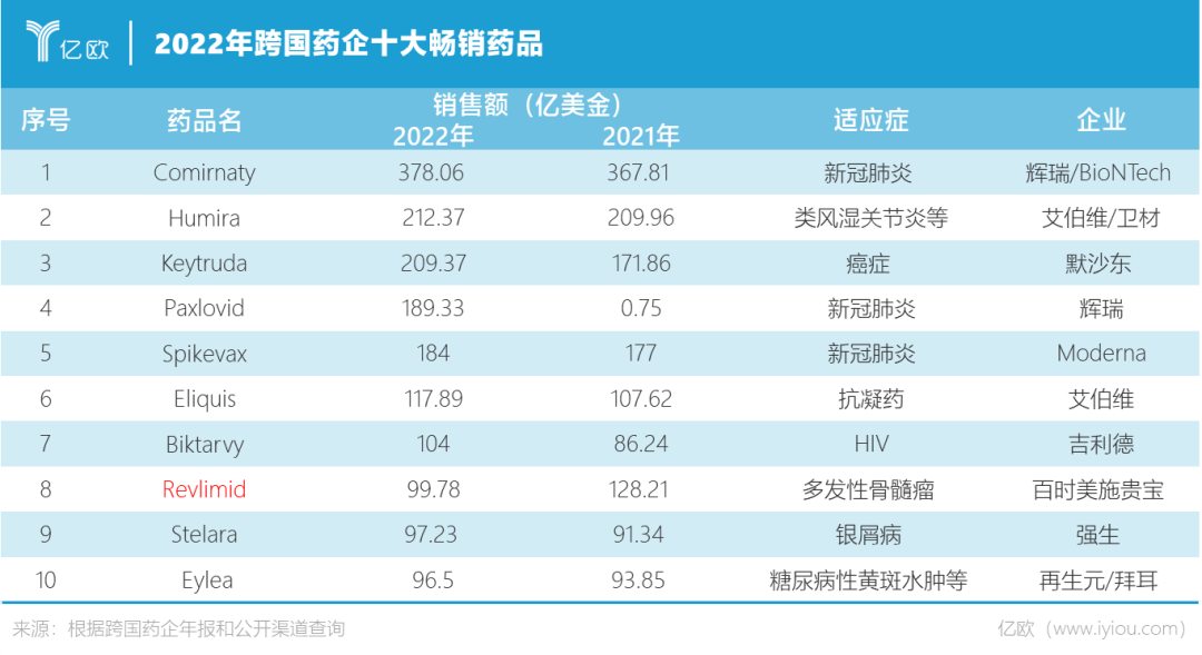在十强榜单中,有表现优异的,自然也有地位垂危的。BMS的血液肿瘤药Revlimid(来那度胺)就以99.78亿美元跌出了百亿美元俱乐部。BMS对这款产品的期待已经大幅降低,预计2023年销售额将下滑到65亿美元。