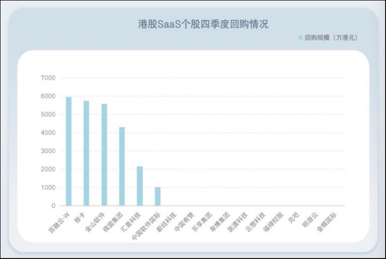港股回购的巅峰时段发生在今年三季度,不过,部分公司在进入四季度后仍然有连续回购行为,诸如港股“股王”腾讯控股(00700.HK),以及SaaS板块中的百融云-W(06608.HK)、金山软件(03888.HK)等。其中,百融云在近一个月时间内耗资近6000万港元回购股份,成为四季度SaaS板块中的“回购王”。