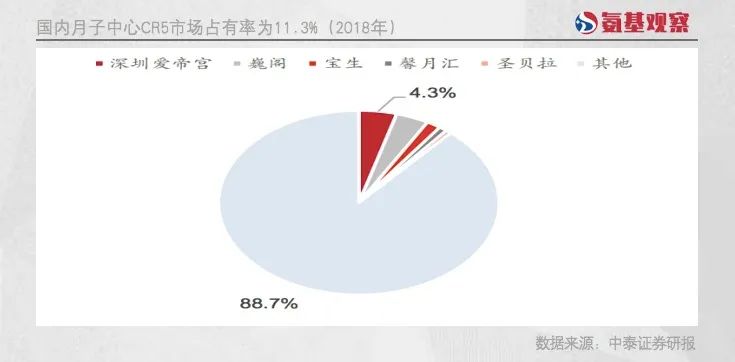 目前,国内月子中心行业并未跑出一个真正的龙头。如下图所示,国内前五大月子中心市场占有率不过10%出头。行业龙头爱帝宫的市场占有率,也不过4.3%。某种程度上来说,这也是月子中心尚未跑出大公司的原因。