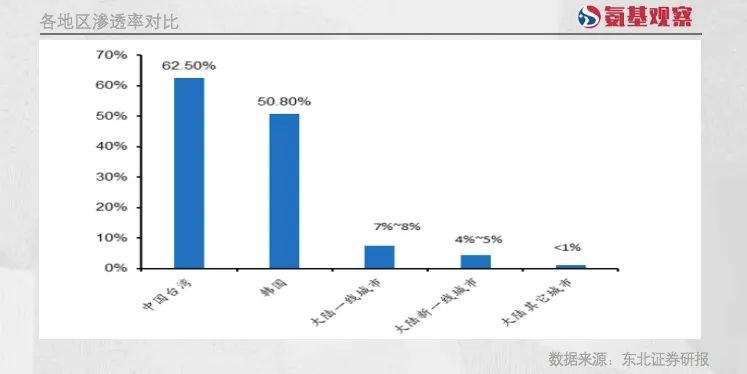 正所谓,没有对比就没有伤害。如上图所示,台湾地区2019年渗透率达到62.50%,韩国地区也高达50.80%。