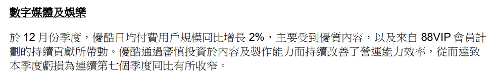 阿里报告中称优酷“审慎投资于内容及制作能力,而持续改善了营运能力效率”,实现了数字媒体和娱乐分部亏损收窄,2022年第四季度从上年同期的13.74亿元减至2500万。