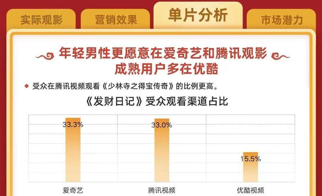 我们选取了票房最高的《发财日记》作为案例。目前公开的票房数据为爱奇艺单平台分账,考虑到该片为拼播项目,在腾讯视频、优酷也都获得了不错的播放热度,因此保守推测实际分账总额有望达到6000万+的水平。