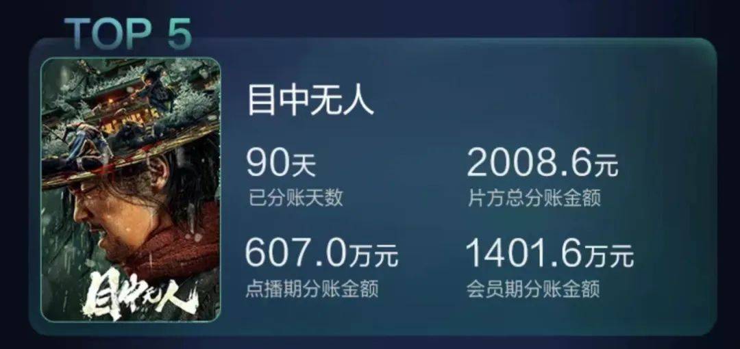 譬如端午档在网上引起不少好评的武侠题材网络电影《目中无人》,目前分账90天总分账金额为2008.6万元。