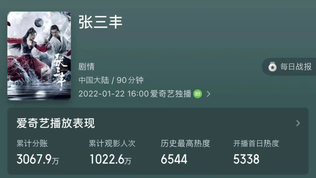 而对比与该片类型相近、同年在爱奇艺独播,以会员分账模式上线的《张三丰》,这部影片目前的累计分账已经达到3067.9万,较《目中无人》高出了1000万有余。