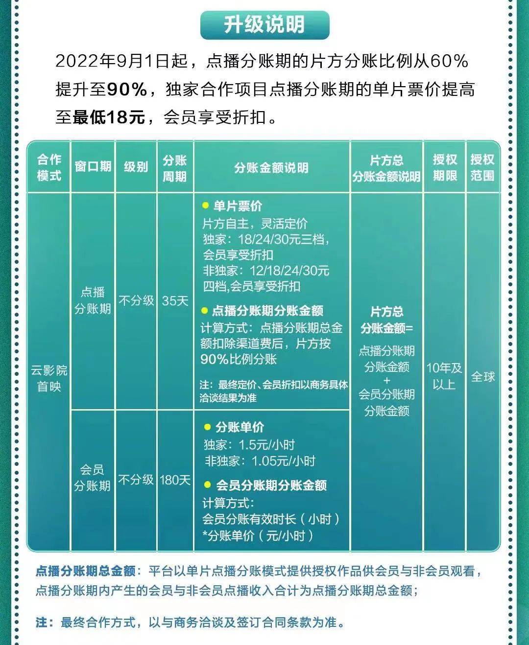 日前,爱奇艺宣布将提升云影院首映模式点播分账期片方分账比例。在扣除渠道费后,片方分账比例从60%提升至90%,暂定执行两年。相较于大部分院线电影的片方分账36%-43%比例,云影院点播分账比例优势非常显著。