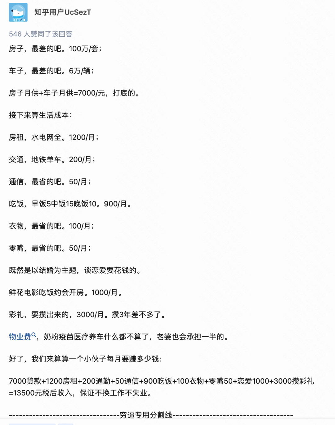 有网友详细地算了一笔账,如果要买100万的房和6万的车,房贷、车贷以及日常生活成本等各类开销合计,一个月需要13500元。
