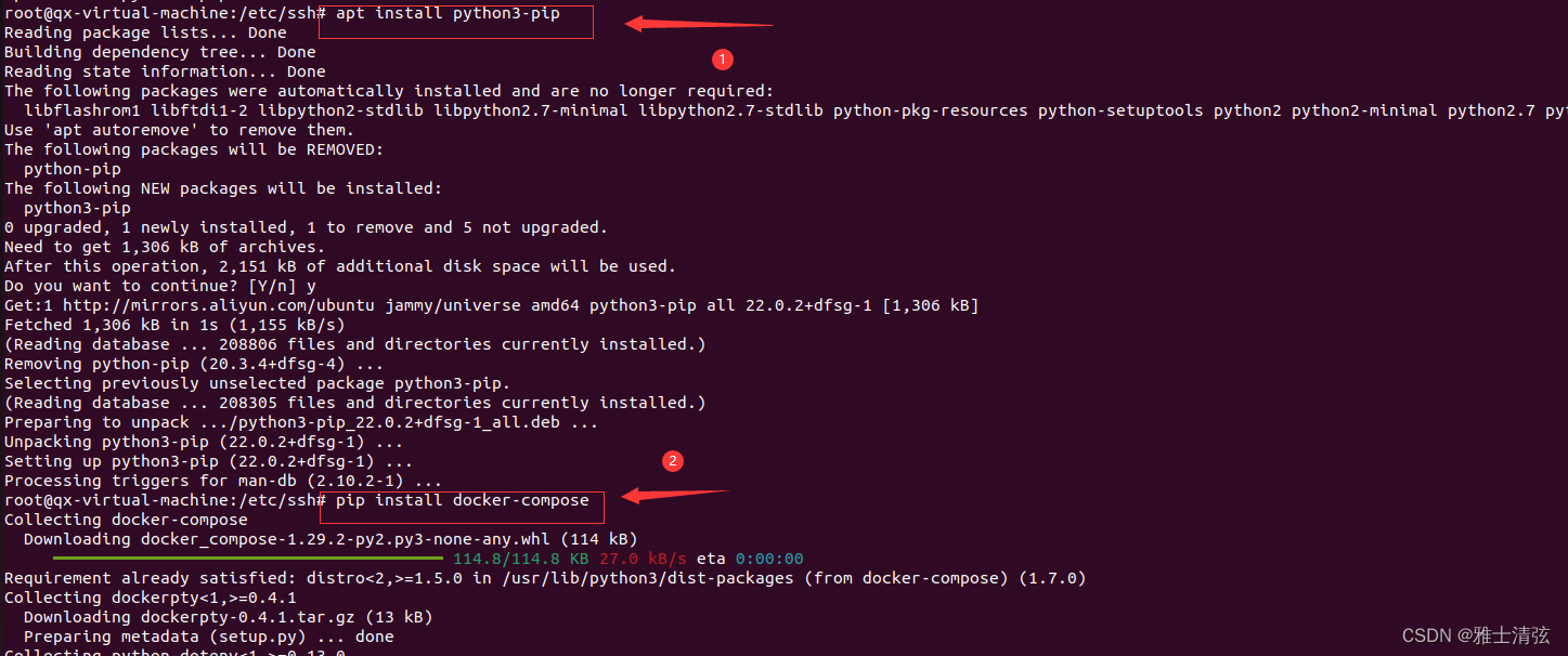 2:输入命令apt install python3-pip ,安装成功之后输入pip install docker-compose,安装docker-compose