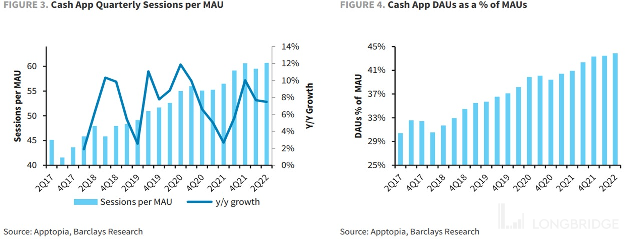 不过已有用户对 Cash App 的使用频次、时常、用户粘性(日活占月活比例)都在稳步提升中。