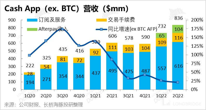 面向消费者的 Cash App 板块在剔除比特币交易业务后,本季实现营收 8.36 亿美元,略高于市场预期的 8.26 亿元。同样剔除 Afterpay 的并表影响后,营收可比增速为 21%,较上季度的 26% 再度放缓。具体来看:
