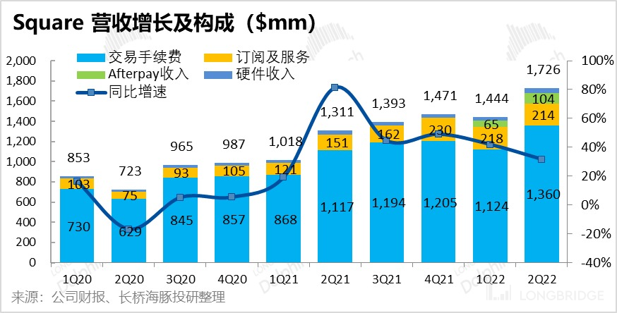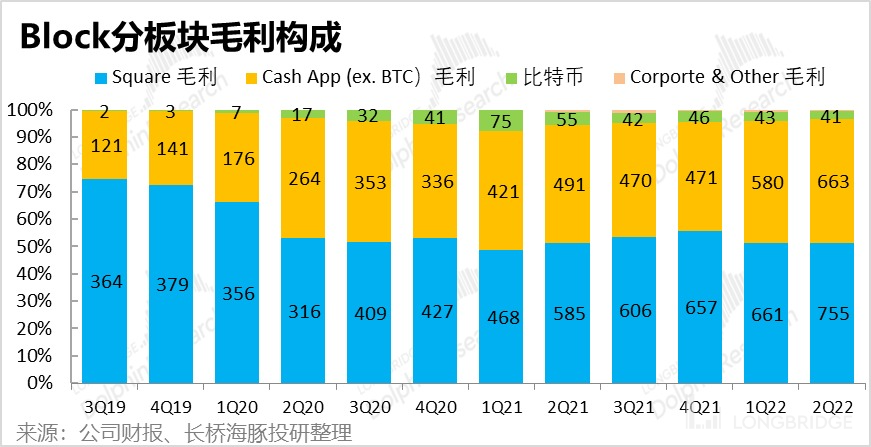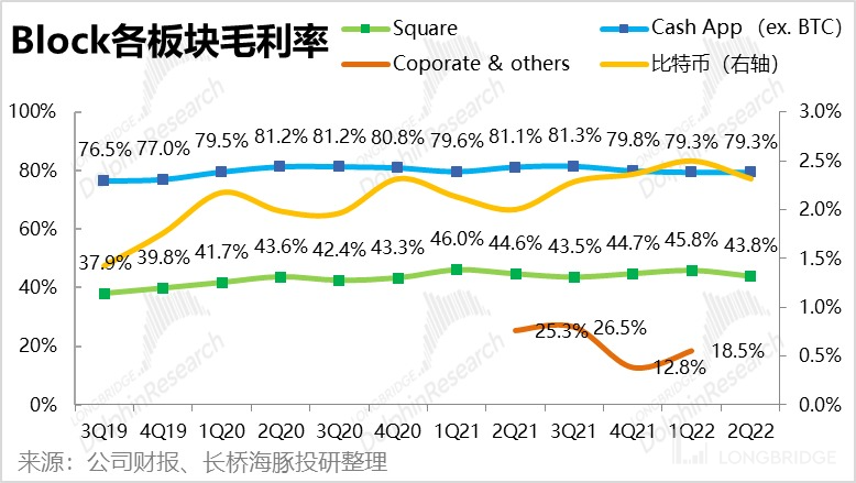 - Square 板块实现毛利润 7.55 亿元,略高于市场预期的 7.4 亿。剔除 Afterpay 贡献的 0.75 亿毛利润后,可比毛利润同比增长了 16%。毛利率环比也由 45.8% 下滑到 43.8%。海豚君认为,毛利率下降的主要是由于支付手续费率下降导致。