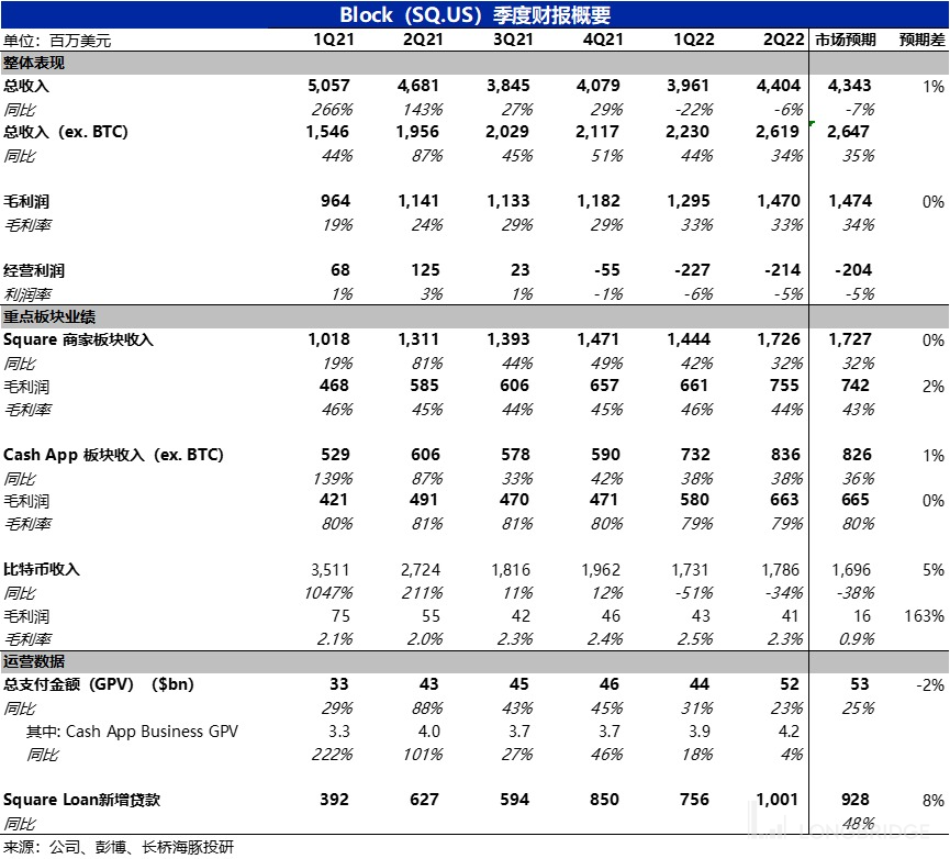 北京时间 8 月 4 日美股盘后,数字支付公司 Block(SQ.US)公布了 2022 年二季度财报。总的来看,公司各项财务表现基本都在预期之内无功无过,缺乏吸引眼球的亮眼之处,财报详细要点如下: