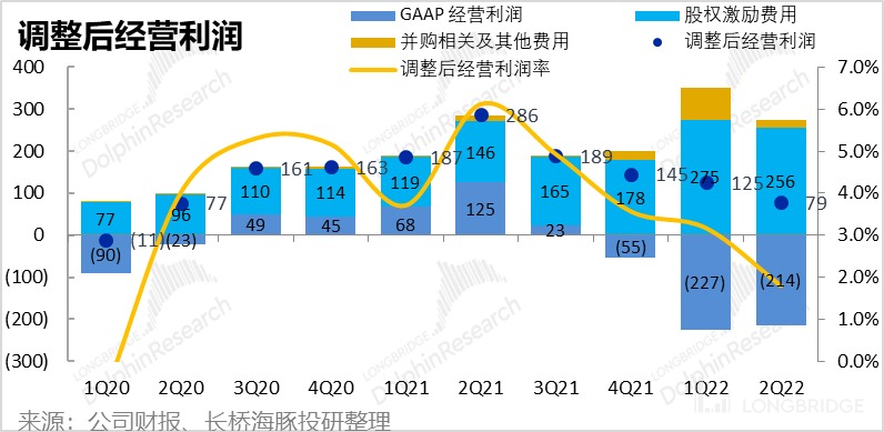 因此,在经营费用增长大幅高于营收和毛利增速的背景下,公司本季再此录得 2.14 亿美元的净亏损。而在剔除股权激励费用和其他调整项后,海豚君计算的 Non-GAAP 经营利润为 0.79 亿元,较上季度的 1.25 亿的进一步缩窄。